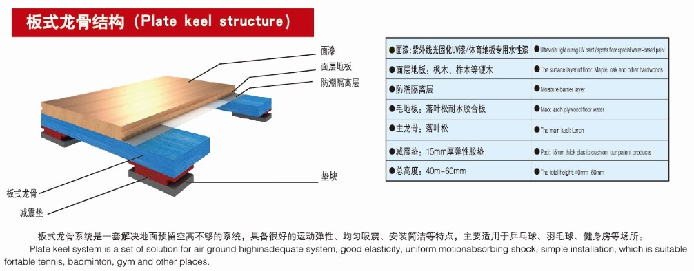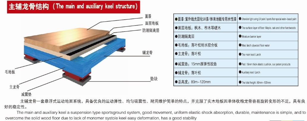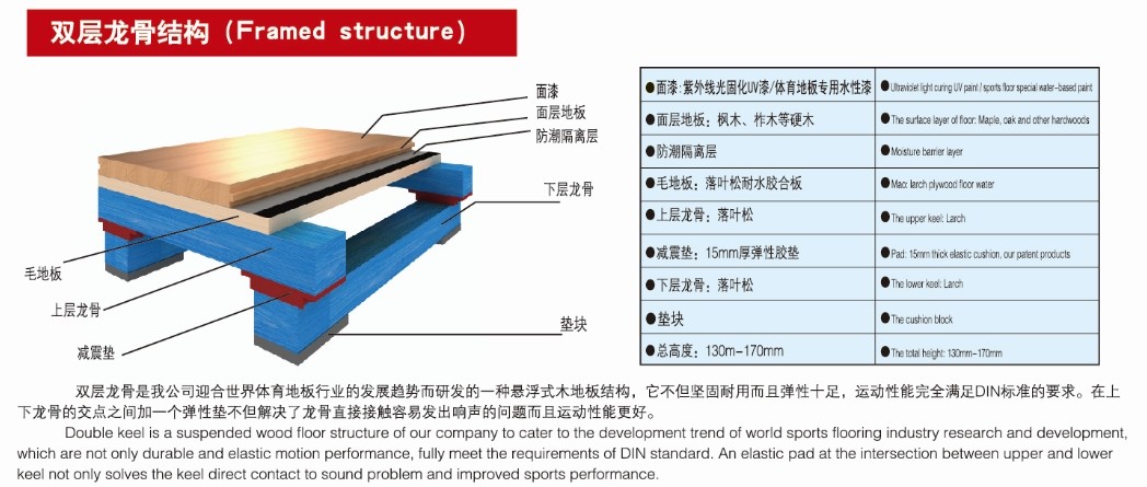 雙層龍骨是我公司迎合**體育地板行業的發展趨勢而研發的一種懸浮式木地板結構,它不但堅固耐用而且彈性十足。