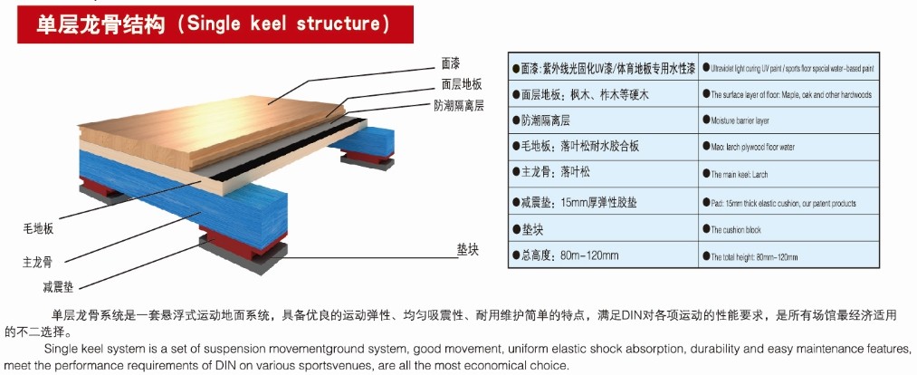 單層龍骨系統是所有體育場館*經濟適用的懸浮系統,具備優良的運動彈性,均勻吸震性。